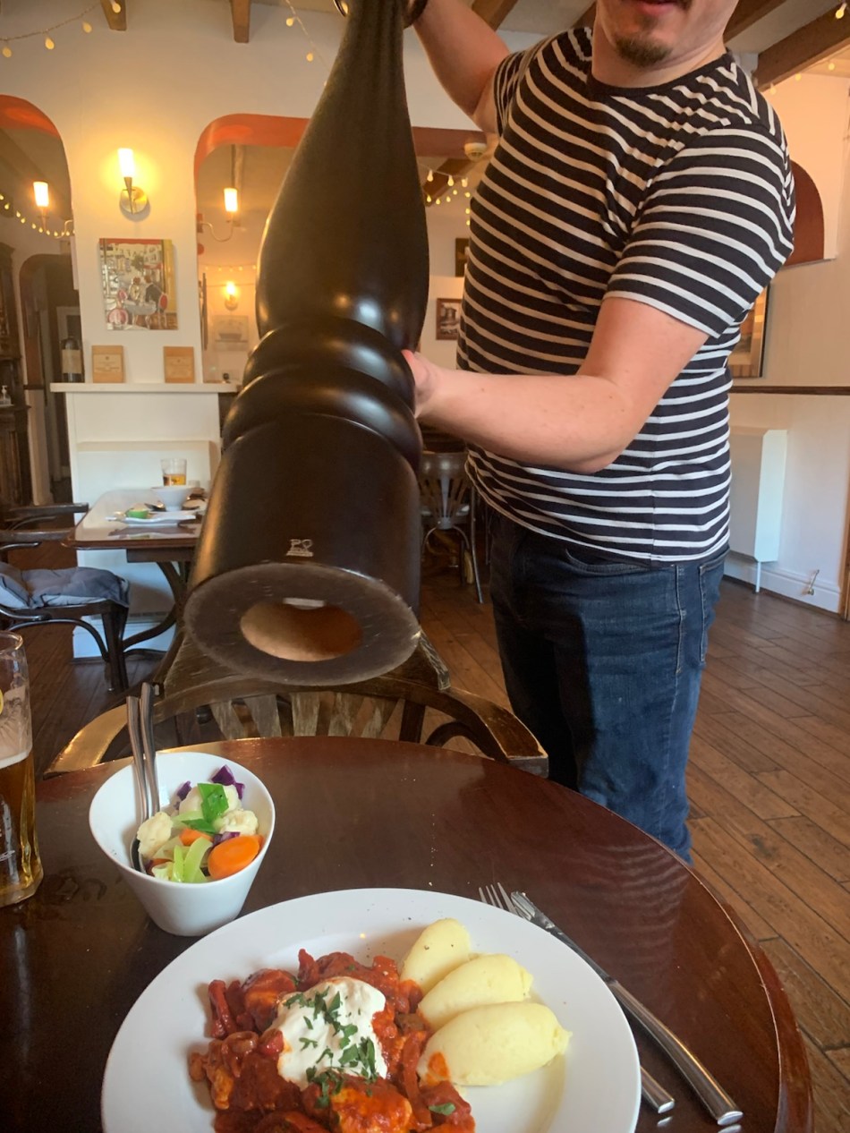 I managed to find another pub last night for dinner, a much better experience than the previous night’s lamb chops. The waiter even had a COVID-19 approved pepper mill which conformed to the social distance recommendation (see photo).