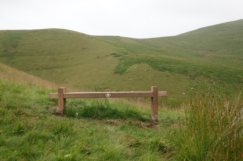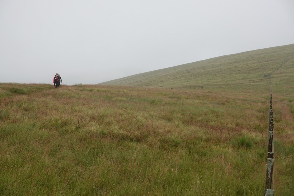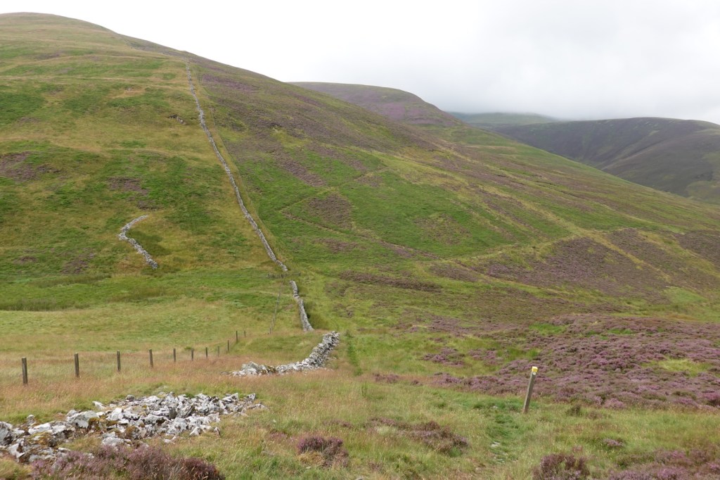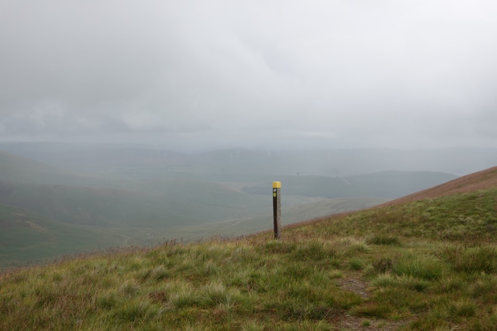 There was no rain but a refreshing bit of moisture in the air and visibility was down as I rose higher into the hills. I climbed a stile over a dry stone wall and I was just lining up an arty photo from the top when I noticed something moving in the bottom left of the viewfinder. People! Four of them. The first sign of intelligent life on the SUW. It was a mother and her daughters and we had a nice chat. They were only walking to Sanquhar but all the same it cheered me up.
