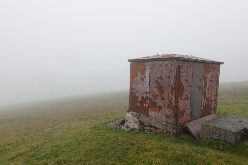 It’s great the way the mistiness enhances the colours of the weathered wood & lichens at the lead mine, the grasses near the slag heaps, the rust & old paint of the shelter, and (are they?) heathery patches on the hills, not to mention the reassuring golden glow of the waymarks!