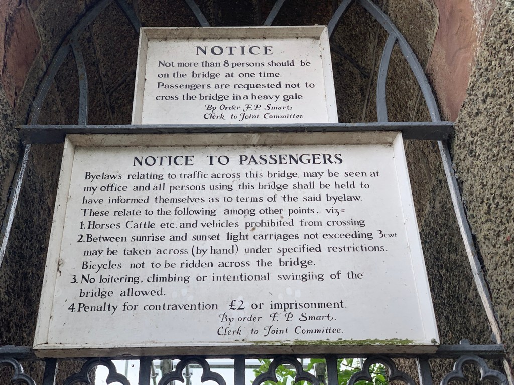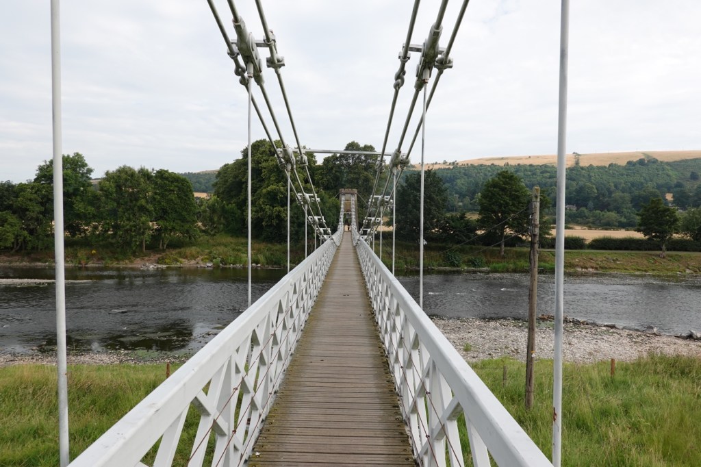 This pedestrian suspension bridge over the River Tweed leads the Southern Upland Way out of Melrose. It’s very old and weighed down by regulations…