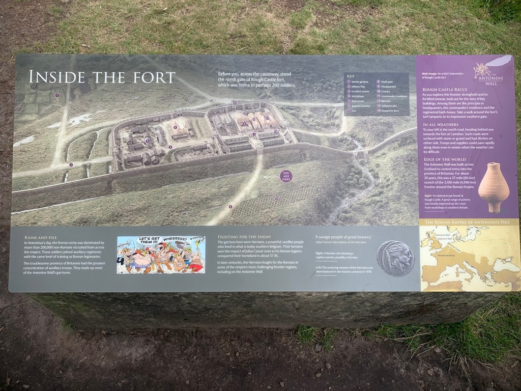 Just before Kilsyth, I came to Croy Hill and a further section of the Antonine Wall and ditch. Apparently, I was standing on the Croy Hill Fort. There was another information board with an artist’s impression of what lay beneath my feet.