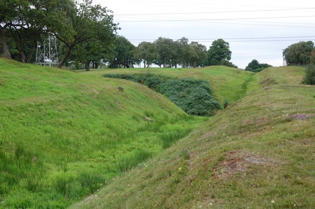 I thought that was the end of it but no! There’s a sequel. Hadrian’s adopted son, Antoninus Pius, conquered the Scottish Southern Uplands before admitting defeat and then they had to build a whole new wall. That made today’s walk a little more interesting. It’s called the Antonine Wall, 63km long, 5m wide and 3-4m high and naturally the John Muir Way runs along it. I started at Rough Castle Fort which is fascinating when you look at the information board (“You are here”) but to the untrained eye it is only a few bumps in the ground. We then set off along the wall which, being built of stone and turf, is more of a ridge and ditch. Not quite as impressive as Hadrian’s Wall.