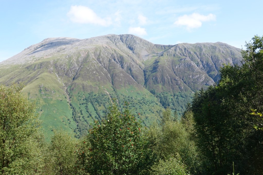Lizzie was waiting at the camp site and we started the final day of the West Highland Way. Whichever way you leave Kinlochleven, it’s steeply uphill. An old military road led us into a secret glen called Lairig Mor which is only accessible on foot. As you’d expect, it was gorgeous, a rich hilly heather covered landscape with masses of wild flowers, butterflies and happy sheep high above us. The sun was shining and it was hot but we could see the whole vista, no mist or rain. Also, any survivors of the desecrated midge population would have died of heatstroke.