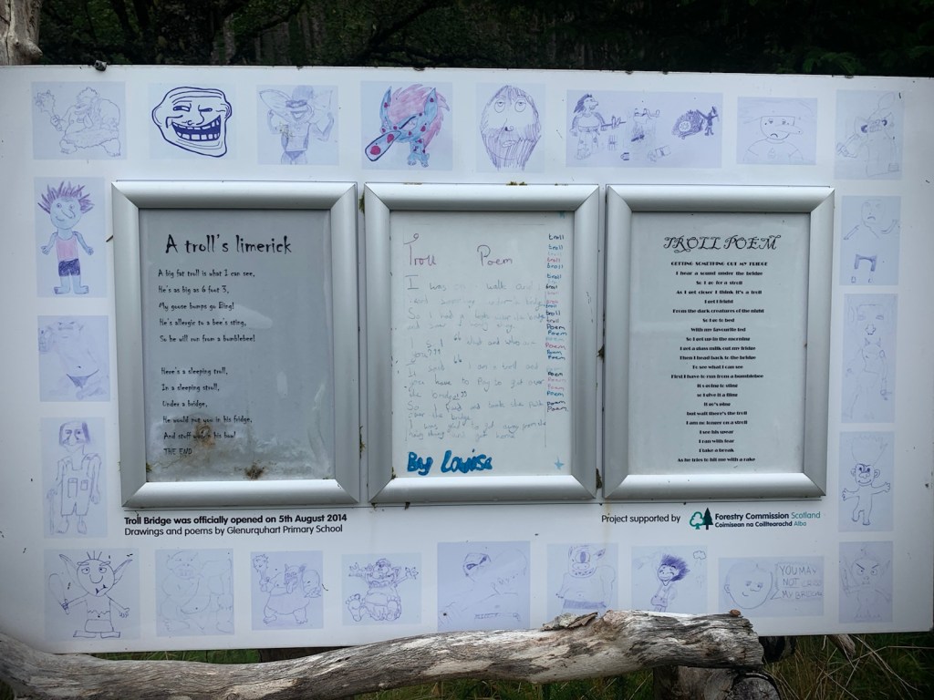 The next challenge was the Allt Saigh and the only way over this raging torrent was the Troll Bridge. There are few things more unsettling to the walker than to come across a Troll Bridge in an enchanted forest. This one dates back to 2014 and the wizards and witches of Glenurquhart Primary School heaped spells and curses on all who cross the bridge with their dark poetry and sinister drawings. I closed my eyes, covered my ears and ran across as fast as I could.