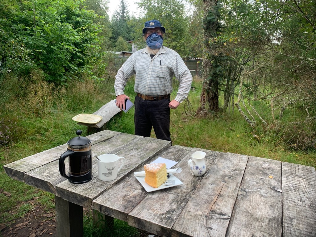 A sign pointed off the path and I followed it to a gingerbread house. Another sign said “Ring the bell, but first complete the contact tracking form”. I hurried through the form and rang the bell. A lady rushed out of the house and said “Hello, who have we here?”. She looked more of a fairy godmother than a witch. I told her I was walking to Orkney. If it wasn’t for the plastic screen I’m sure she would have hugged me. She came from Orkney and missed it every minute of every day. She was brought up on a farm on the tiny island of Egilsay where I will start the St Magnus pilgrimage. Oh, how much she wants to walk that pilgrimage! She disappeared and soon her husband arrived bearing a large pot of coffee and a giant slice of lemon cake. Very impressive as they don’t have electricity.