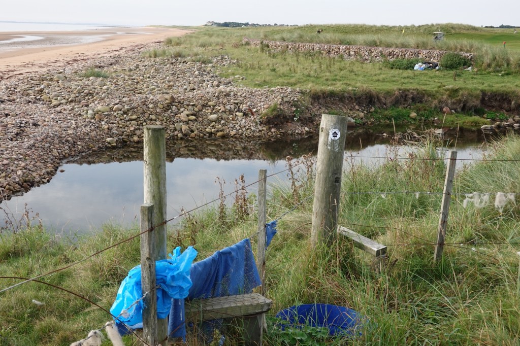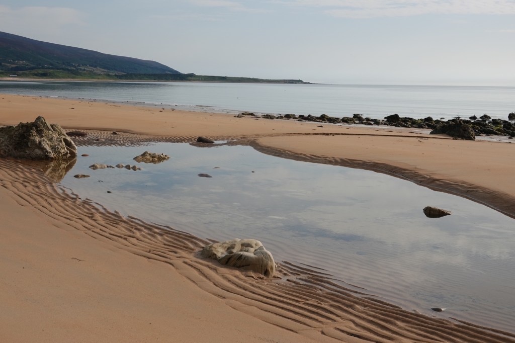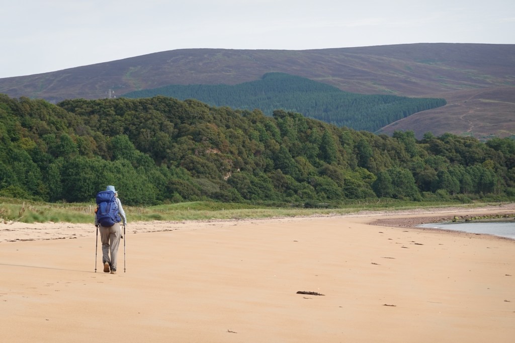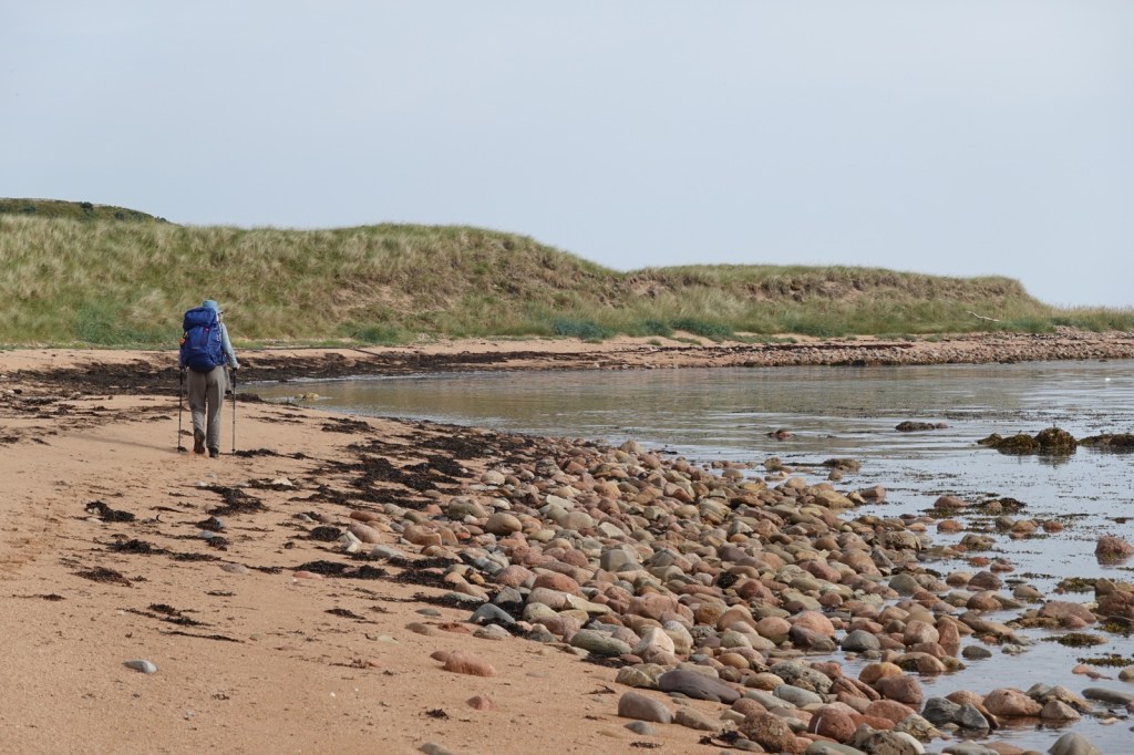 We set off with our Co-op ham and cheese sandwiches and headed for the beach but it wasn’t a seaside holiday. You couldn’t hear The Beach Boys playing in your head nor look around for a nice spot for your deckchair. We followed the waymarks of the John O’Groats trail north along the deserted golden sandy beaches, over boulders, pebbles and shingle, climbing occasional fences and fording burns. Yet again, the weather was amazing; blue skies and bright dazzling sun requiring sun glasses and lots of sunscreen.