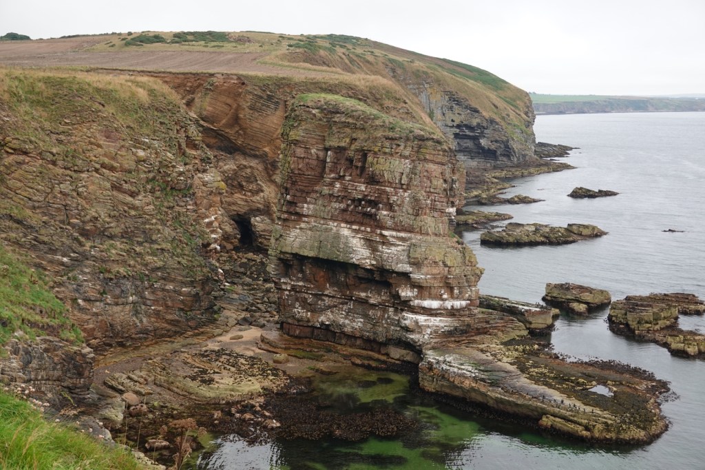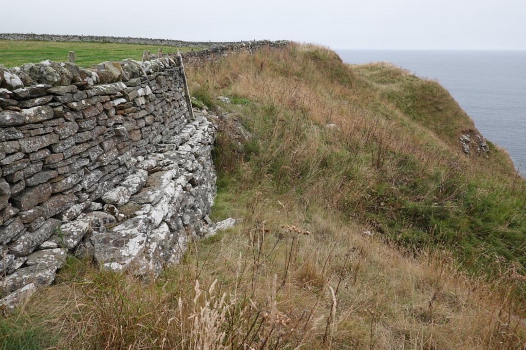 My walk started in Dunbeath Bay, one of many little fishing harbours and I headed up to the cliff tops. Immediately, the full splendour of the dramatic Caithness coastline appeared ahead of me. Giant cliffs, sea stacks, arches, inaccessible bays etc.. My route took me past pastures which run almost to the cliff edge and the farmers have built sturdy barbed wire fences to stop their livestock plunging over the edge. Walkers therefore follow the trail between these fences and the cliff edge and it isn’t terribly wide.