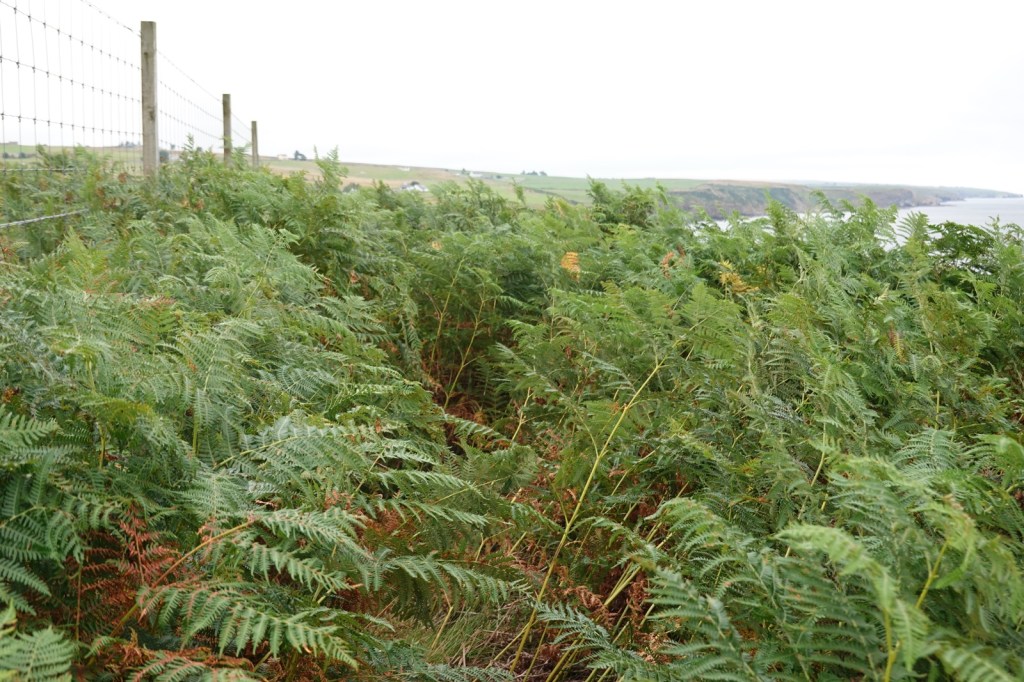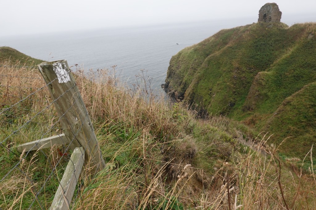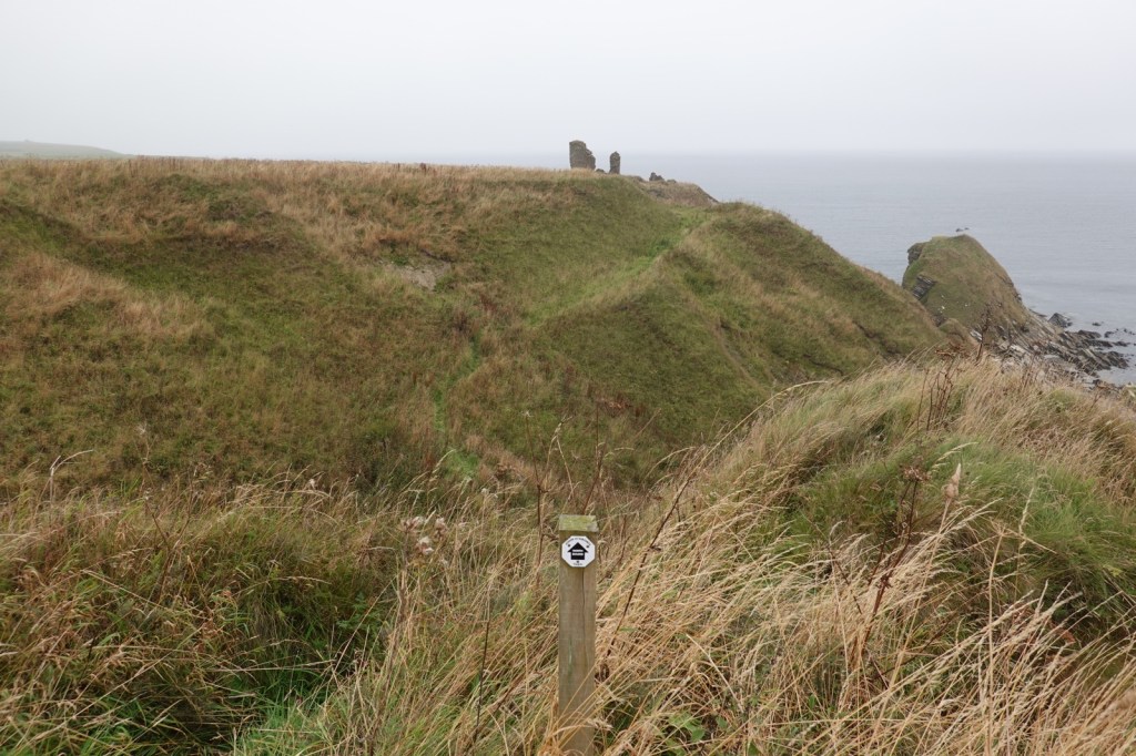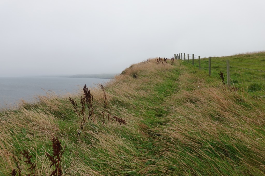 I was expecting these last four days on the John O’Groats trail to be difficult. I’ve read the warnings about the cliff top “path” with its sheer drops into the abyss, the overgrown vegetation (especially bracken, thistle and common nettle) and the steep rises and falls as the many burns are encountered. It certainly was a hard day. 14Km from Dunbeath to Lybster took me from 8.15 to 14.30. I then took a farm track to my B&B, The Antlers, in Occumster because a thick fog descended. That was fortunate because my B&B said the cliff path from Lybster is impassable.