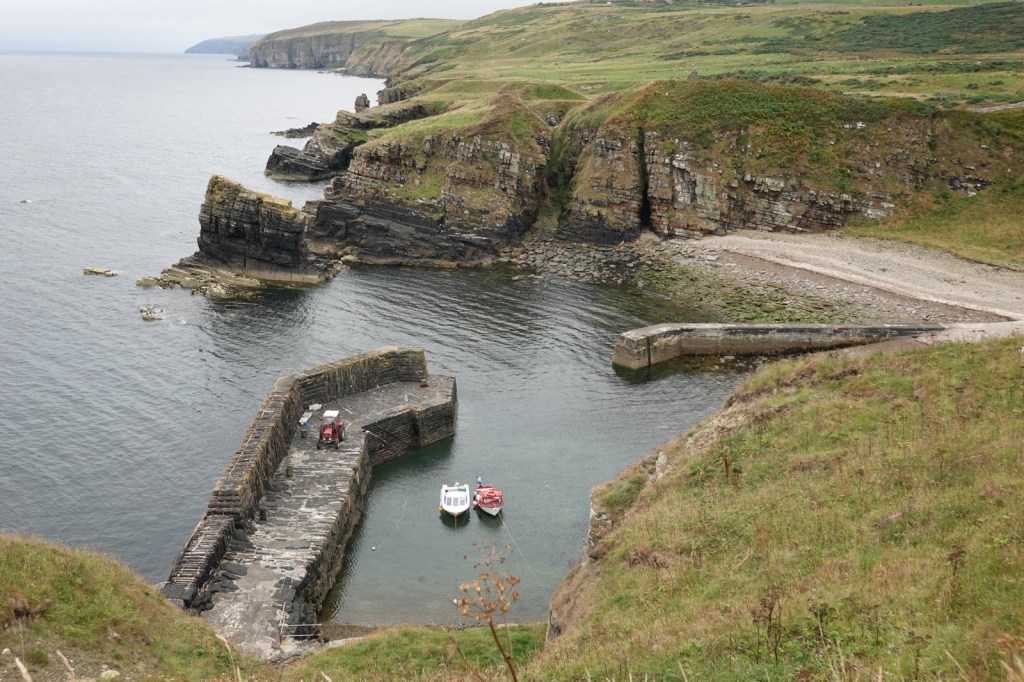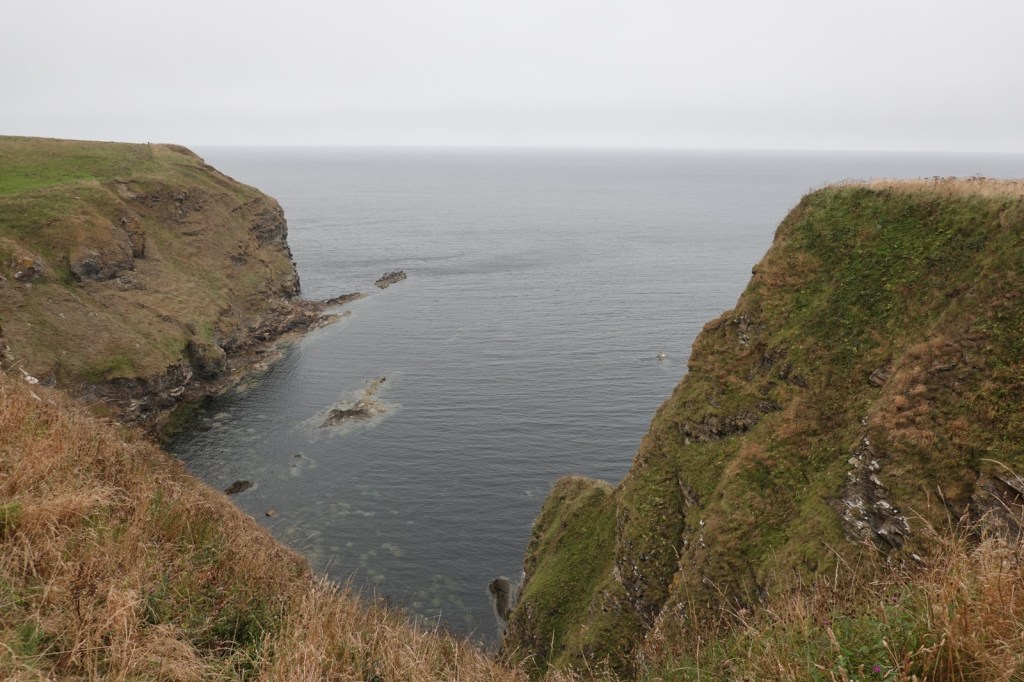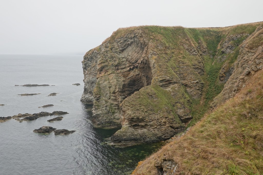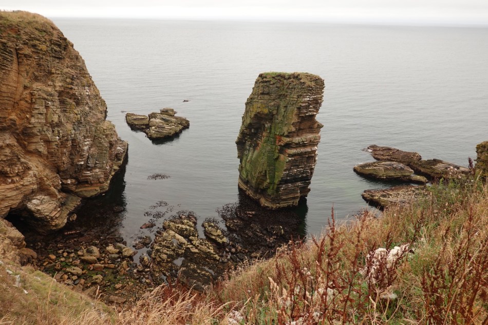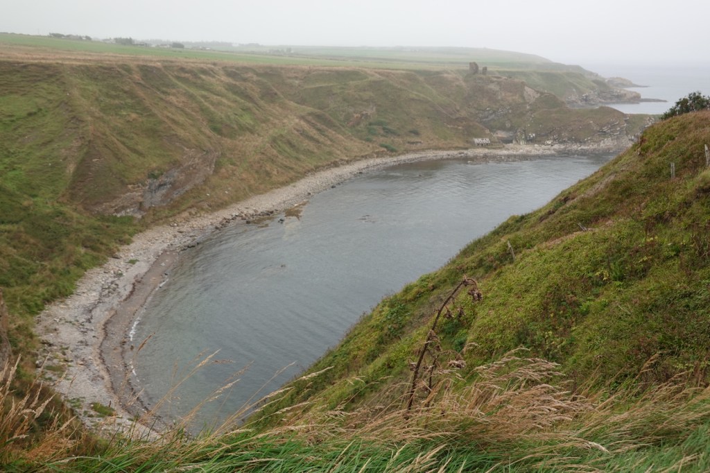 I was expecting these last four days on the John O’Groats trail to be difficult. I’ve read the warnings about the cliff top “path” with its sheer drops into the abyss, the overgrown vegetation (especially bracken, thistle and common nettle) and the steep rises and falls as the many burns are encountered. It certainly was a hard day. 14Km from Dunbeath to Lybster took me from 8.15 to 14.30. I then took a farm track to my B&B, The Antlers, in Occumster because a thick fog descended. That was fortunate because my B&B said the cliff path from Lybster is impassable.