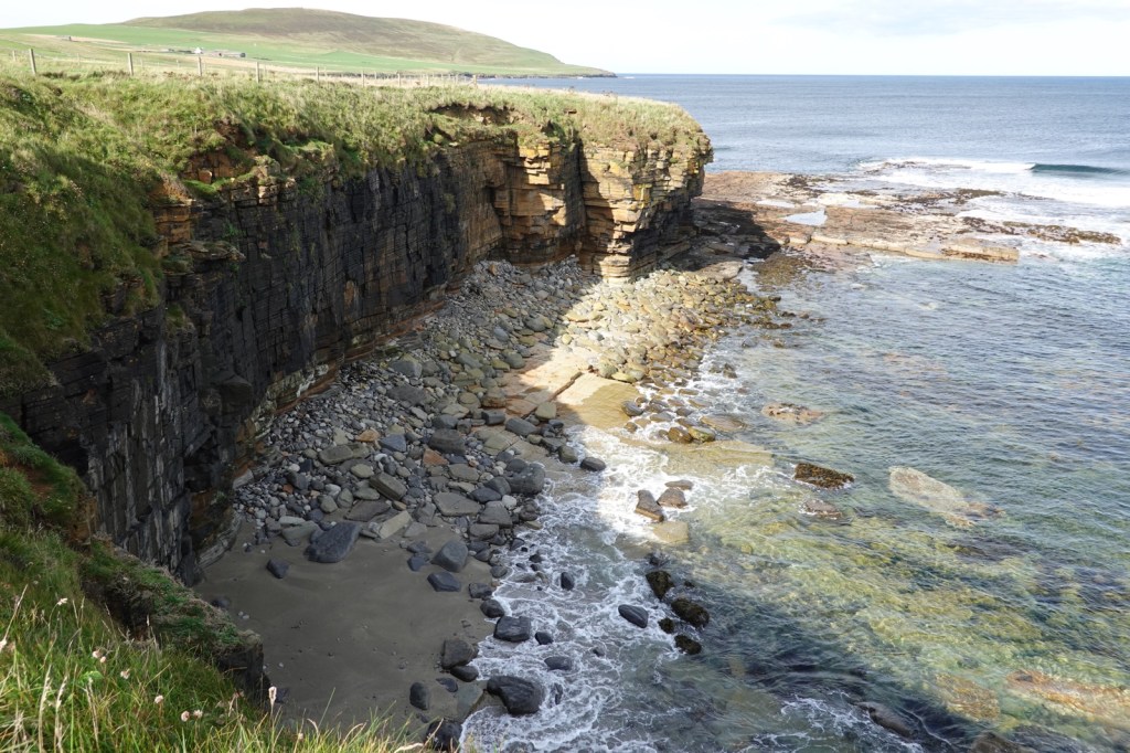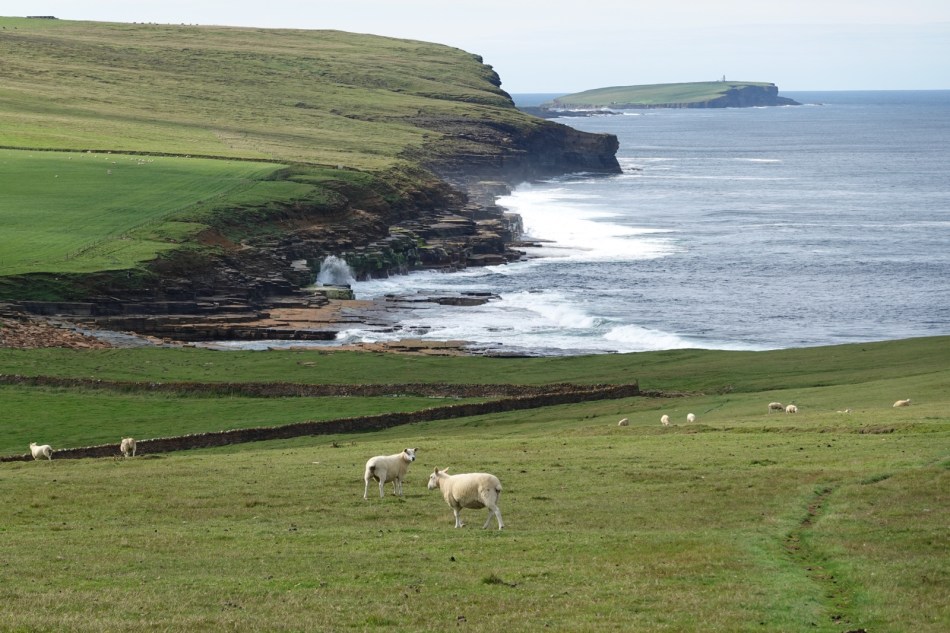 The trail itself was surprisingly hard. It follows the journey of St Magnus’s body from Evie to the church in Birsay. The day’s theme was Loss and my iPhone played appropriate Orkney music and poetry at key moments. I had to walk along the beach, clambering over slippery boulders, climb steep hills and navigate more cliff top paths, but this time with the ferocious Atlantic smashing against the cliffs. At Northside near Birsay, I had to edge past a huge cliff fall which happened only last week. The cliffs are unstable here. But it was a great walk with millions of sea birds in the air and seals in the ocean. The sun is still shining.