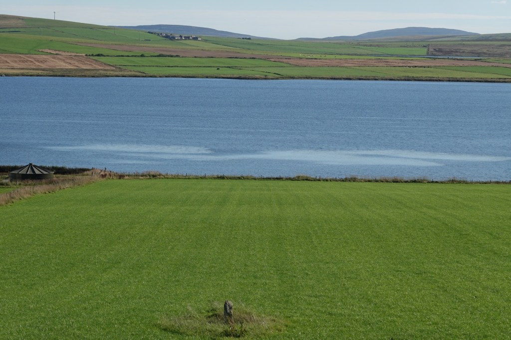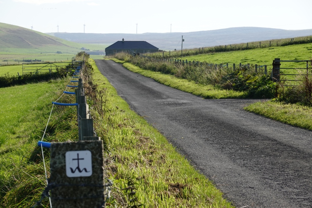 The St Magnus pilgrimage app is growing on me. It bursts into life as I pass a point of interest and plays its Orkney theme and stamps my credential. When I press the icon she tells me everything I need to know, just like one of those audio tours but you don’t have to look for a little number in the grass. It knows where I am. Look at those farm buildings ahead… she says in her fine Orkney accent and explains how their name, Kirbuster, links them to the Church. The only evidence for this is in the name, and a 15th century sandstone Baptismal font found in the nearby Loch.