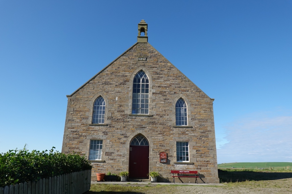 My rest stop today – the church in the village of Twatt. A lovely bench.