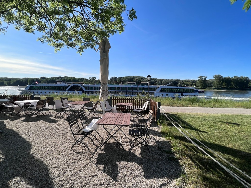 Actually there’s cheaper rooms in Hainburg but I feel I owe it to Booking.com who paid for my half night of luxury in Luton. And anyway this is rather pleasant because it’s right on the banks of the Danube and I have a litre of Zwettler on the table while the most enormous river cruisers pass me by, sailing upstream. The river flows for 2850Kms from its source somewhere in the Black Forest to its mouth in Ukraine’s Black Sea and it hasn’t far to go.