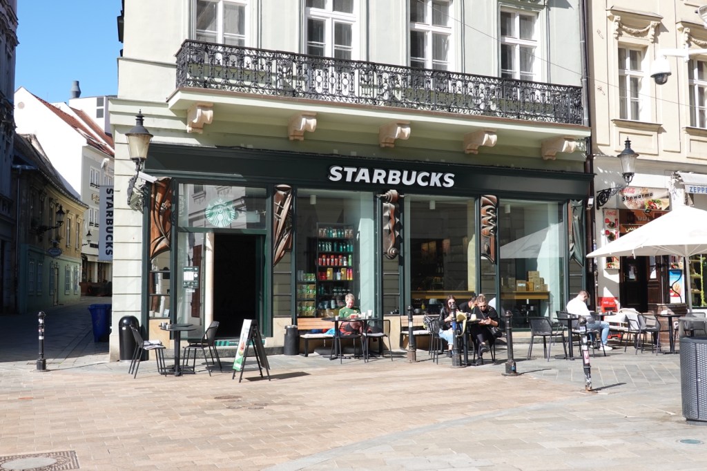 I had an interesting walk today. After quite a lot of fussing around I finally heaved my pack onto my back and set off from the hostel towards downtown Bratislava. First stop on any pilgrimage (for me) is of course Starbucks. There were other cafes around the Square but even the Slovakian army were there so I went in and ordered a cappuccino and croissant. The next priority was St Martin’s Cathedral where I found a nun who stamped my credentials. Now I’m officially a pilgrim on the Camino.