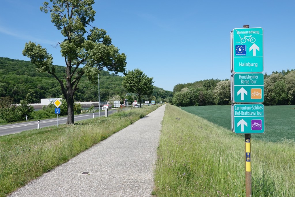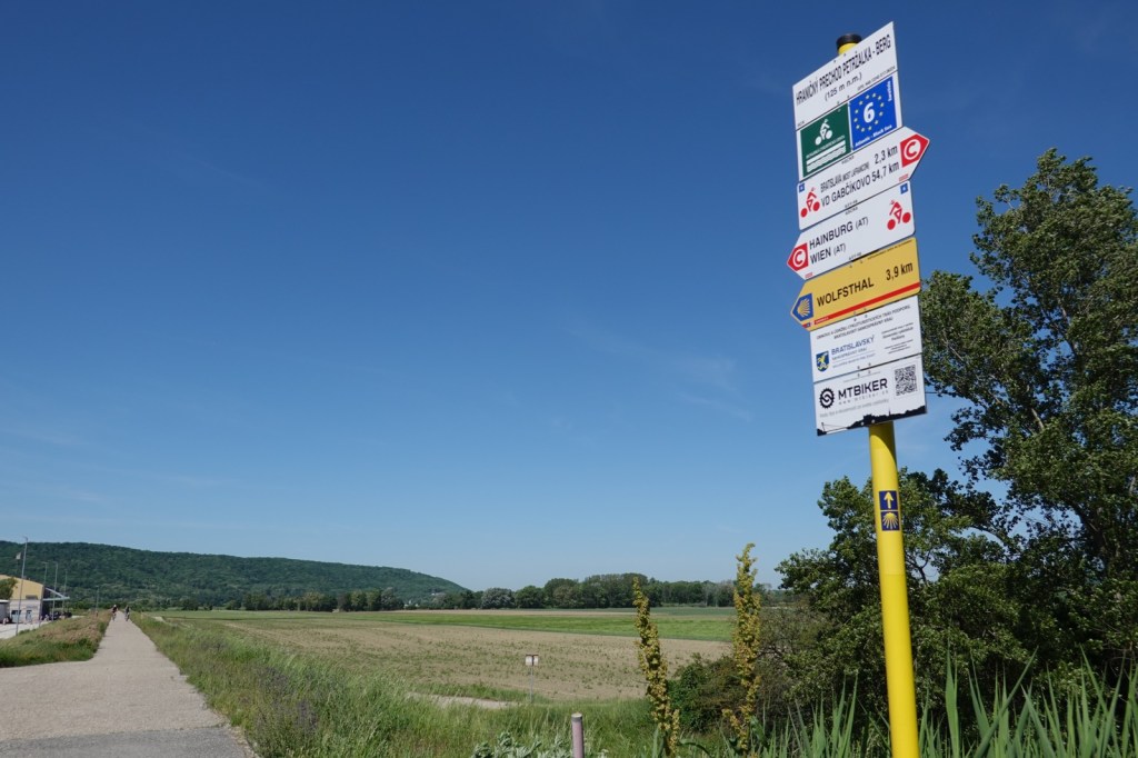 The border with Austria comes quickly but not as quickly as I was expecting. It’s not the river because Slovakia continues on the opposite bank. I crossed the bridge and walked past some old Czechoslovakian border defenses and then I found it it. The old Iron Curtain is a distant memory, all mercifully swept away. I stood on the border and reflected on the terrible history inflicted on Europe by the USSR. I took a selfie. On a more cheerful note, the Austrian border control buildings lay derelict, swept aside by Schengen.