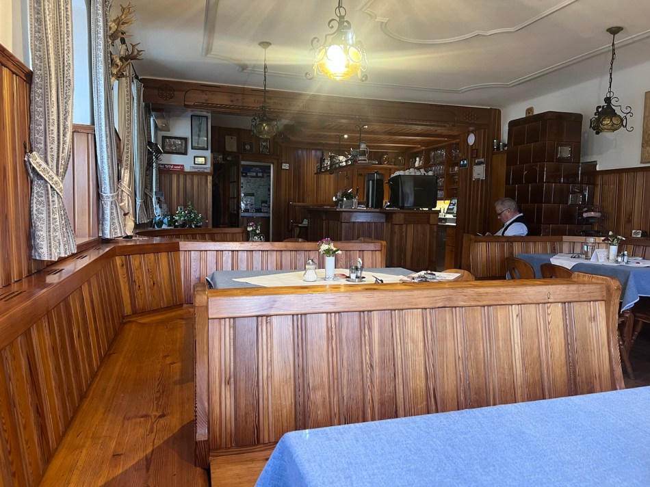 I’m in a traditional inn tonight in Stephanshart (see photo above). It’s mostly wood, great big carved seats, wooden beds, the bar, the ceiling etc.. There is a large carved wall clock which chimes every 15 minutes. I’m the only one here, the owner promised me dinner but he’s still sleeping off his lunch.