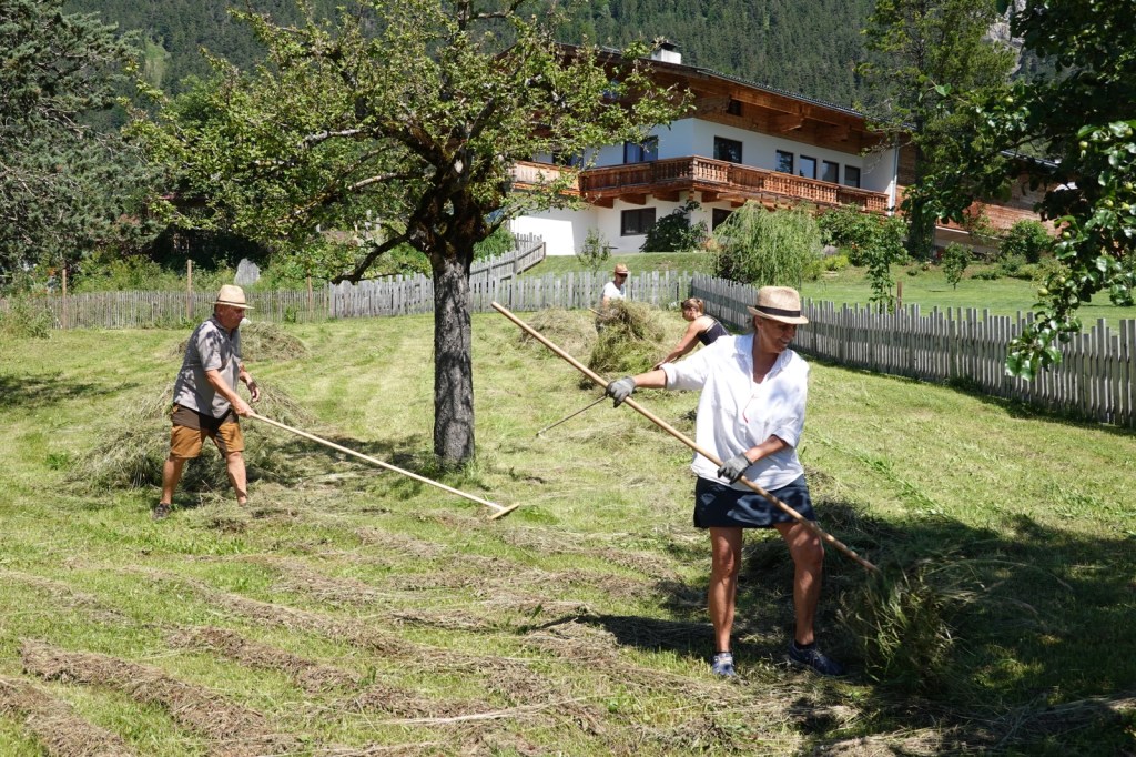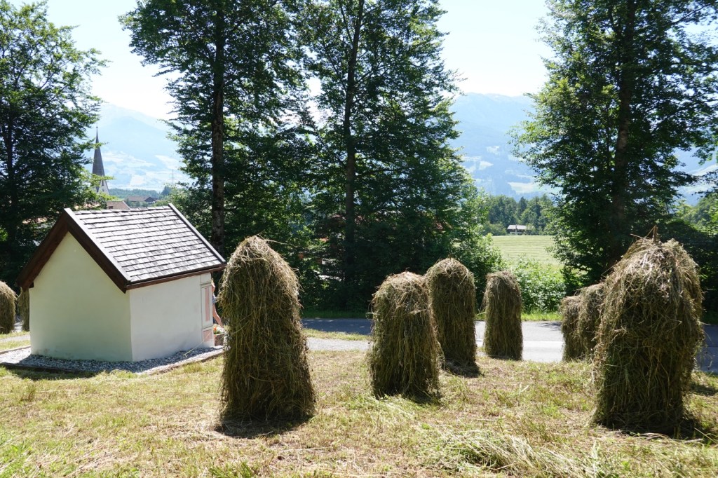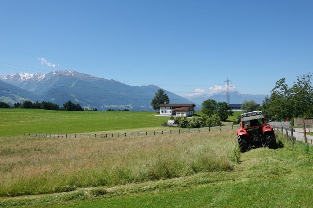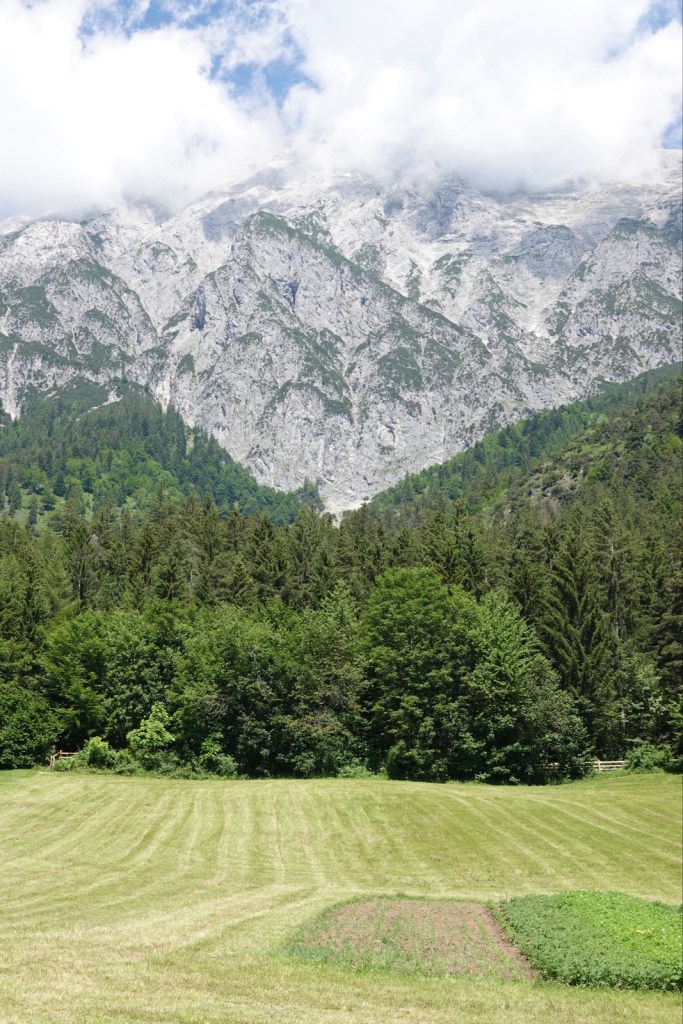 That aside, today was a spectacular walk. I was right up against the mighty Alps and there’s nothing more impressive than looking at mountains, close up. The sun was shining and everyone was fully focused on making hay. The recent rain has been a problem but the forecast is good and all the tractors are out, cutting the grass and stacking it up. I spoke to some people who were making hay from their own small holding in the traditional way, “to feed the animals in the winter”. Later, I saw a woman stacking the cut grass in pillars. All this is going on just a few kilometres from Innsbruck.