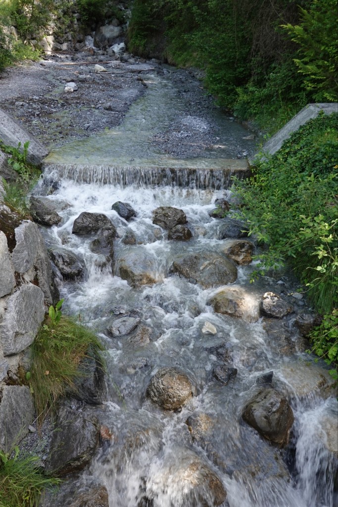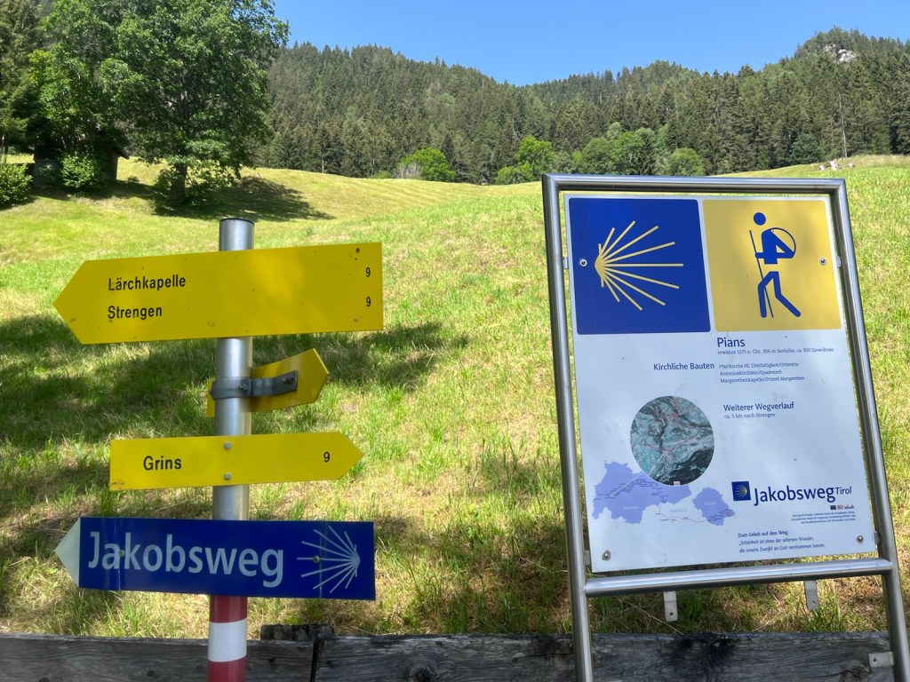The forecast was for 29 degrees and it was correct but up in the hills it didn’t feel so hot. There was a refreshing breeze as I climbed and climbed the Arlberg massif. I reached Grins and visited the church of St Nikolaus, just to sit down in the cool. After that I passed several villages, none of which had a cafe until I reached Flirsch. A small beer was all I needed to decide to press on to St Anton. It means I can get the train straight back on Monday and resume walking over the watershed towards Switzerland without having to backtrack by bus to any of those isolated villages.