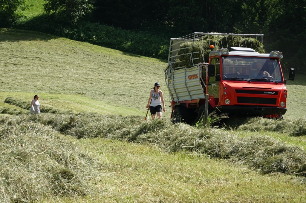 The countryside was full of people making hay. All the hay making equipment was deployed and the whole family was raking up the grass.