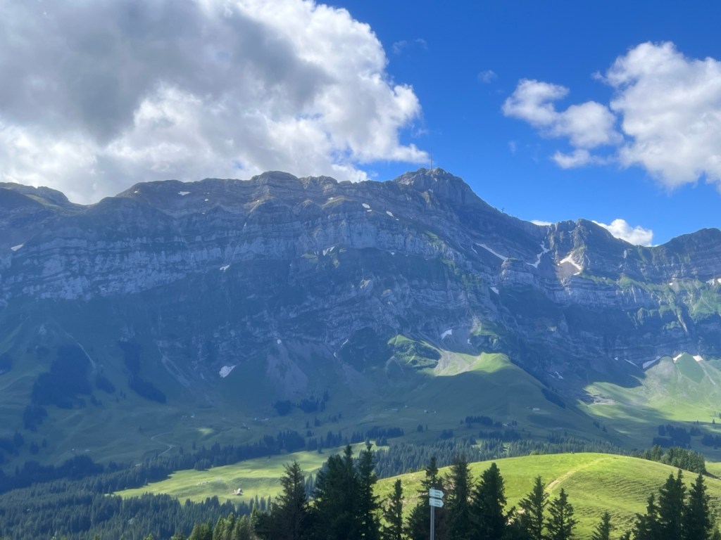 The weather here is unforecastable. Yesterday was rain, thunderstorms and mist; today was big blue skies and sunshine. I therefore took the opportunity to take a cable car ride up the Kronberg mountain, a climb from 850m to 1640m. We don’t have many cable cars in Britain so I couldn’t miss the thrill of dangling from a cable up in the Alps. It might not be the Aiguille du Midi but the views from the top are breathtaking. I could see all the way to Konstanz on the Bodensee.