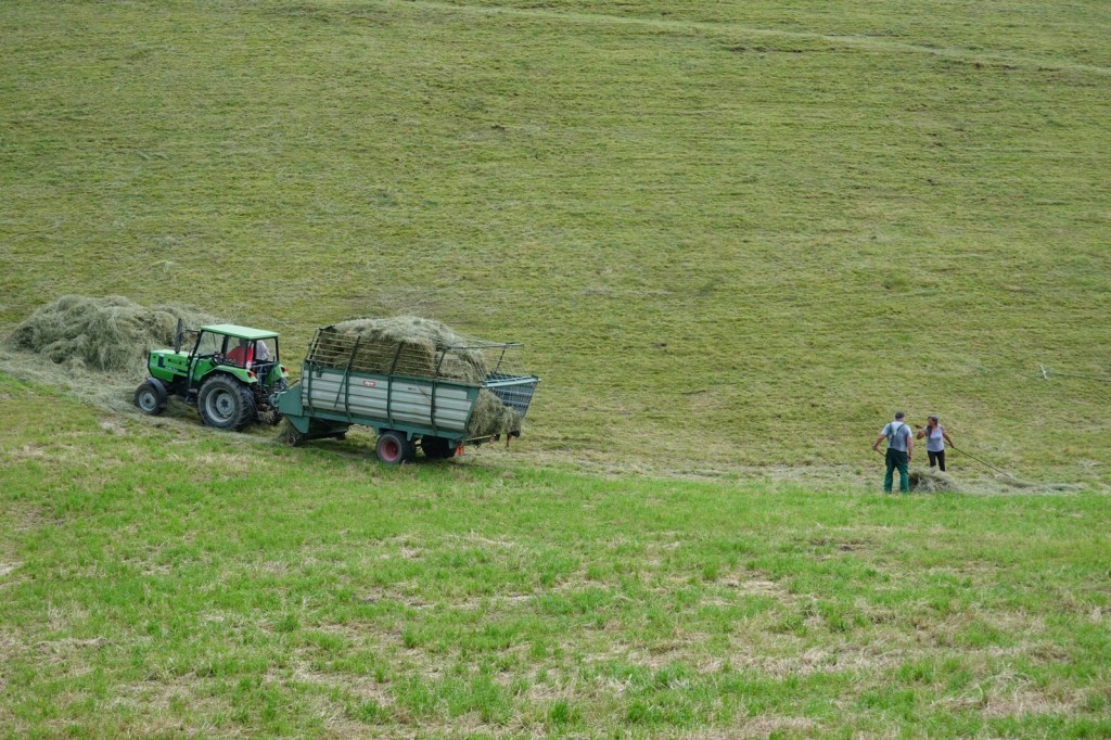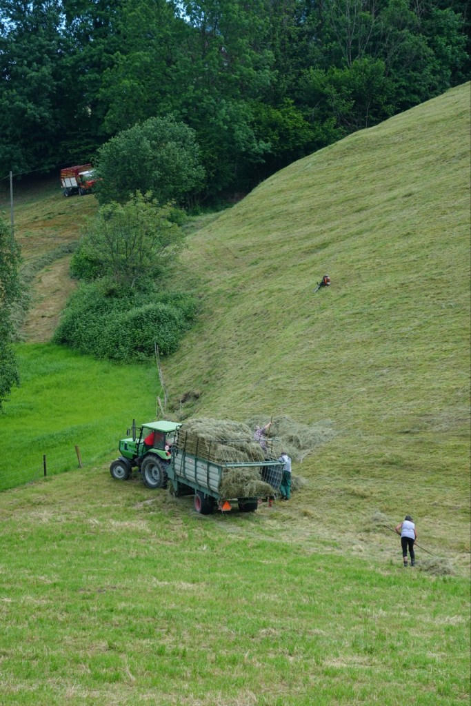 Am impressed that the farmers are mowing hay on such steep slopes then using a blower to move the hay to a level where it can be collected 😕