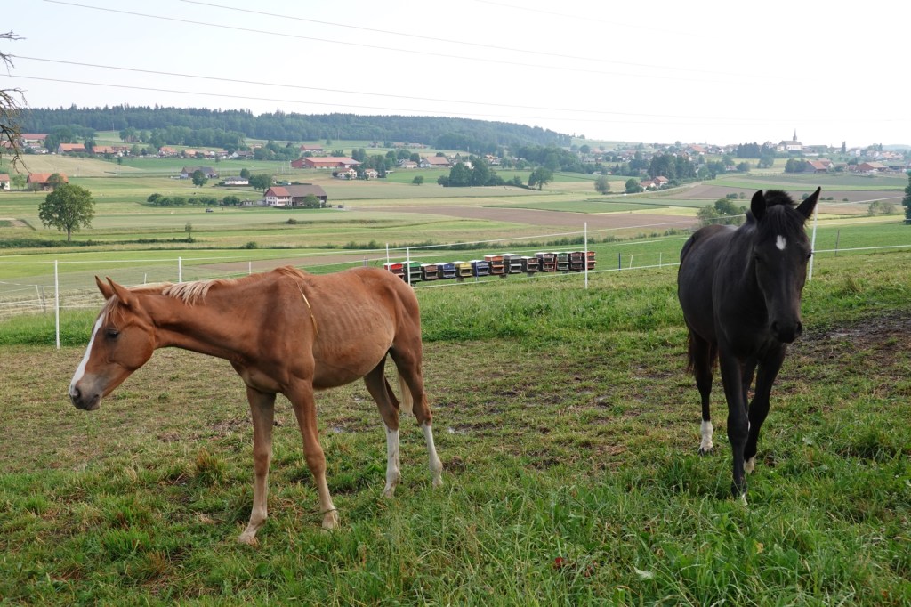 Are those coloured boxes (in the background of the photo of the horses) beehives? No wonder the flowers are glorious!