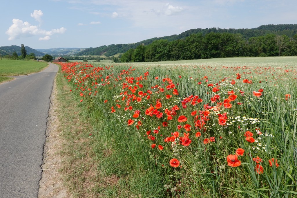 I can’t remember very much about the walk. We started before 7am and reached Romont by 9am. It’s a pretty small French town. A cafe and boulangerie shared a few tables on the pavement; one provided the coffee while the other provided the croissants. We continued on the flat or slightly downhill path surrounded by endless poppies to Moudon for a proper French lunch and then continued along the river towards our B&B.