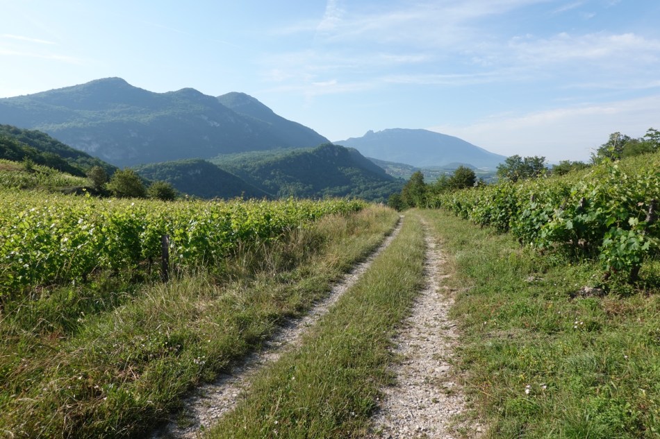 We were a little sorry to leave the rustic farmhouse this morning but we were soon back on the GR65. Sebastian gave us a picnic because it’s Sunday and the shops are closed. The landscape is predominantly vineyards as far as the eye can see. We climbed a hill (855m) and descended to the banks of the Rhône (300m).