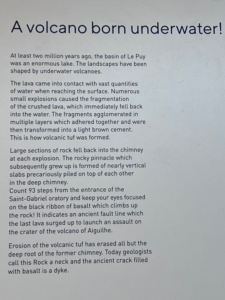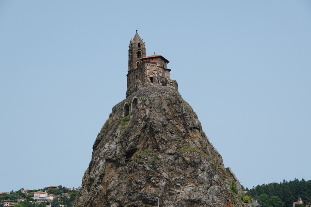 Then it was over to the Rocher et Chapelle Saint-Michel d’Aiguilhe, the real symbol of Le Puy-en-Velay. A further 268 steps led me up the volcanic plug to the 57m diameter top which holds the little chapel and hermitage. It was the Bishop Godescalc of Le Puy who was the first ever pilgrim to cross the Pyrenees to reach Compostela and he built the chapel when he returned in 951 and dedicated it to Saint Michael the Archangel. French engineering at its best.