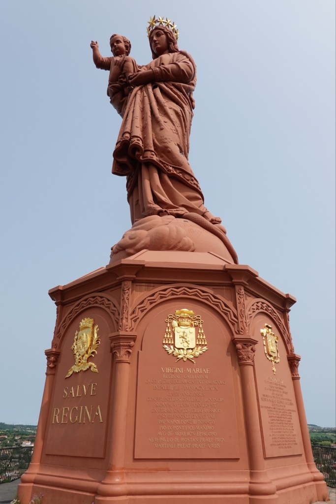 Next stop was the statue of Notre Dame de France. 213 Russian cannons captured during the siege of Sevastopol in the Crimean War (1856 to 1860) were melted down and used for the statue which has dominated Le Puy ever since. In I went and climbed up and up 262 steps until I reached the crown where a metal ladder drew me upwards until my head poked out the top. What a view over the city and onwards.
