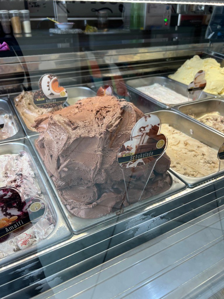 At one point I escaped up some rusty steps to one of the Grimms villages in the woods and found an ice cream shop with wonderful industrial machines in the back, noisily stirring the gelato. I wasn’t tempted (remembering Hansel & Gretel) but I had a cappuccino.