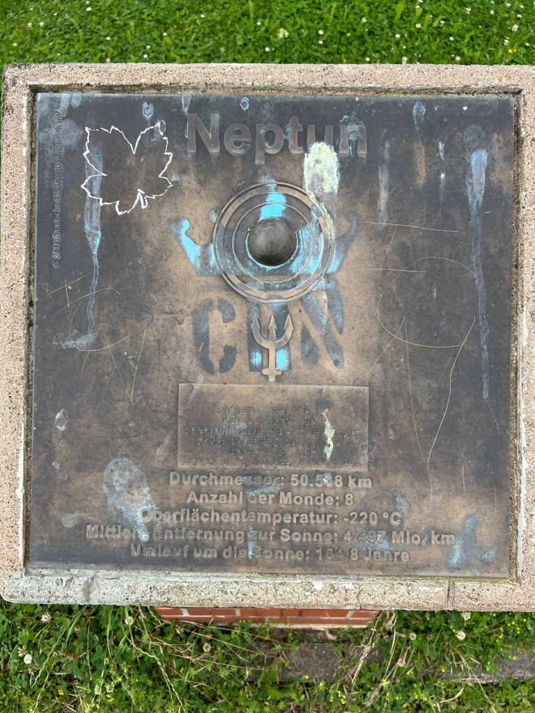 I was expecting a pleasant walk along the river but it was a tarmac international cycle way, the river on one side and a wooded area on the other. Electric bikes sped between Cologne and Bonn at alarming speeds and the path went on to infinity. I know that because I passed a sign to the planet Neptune.