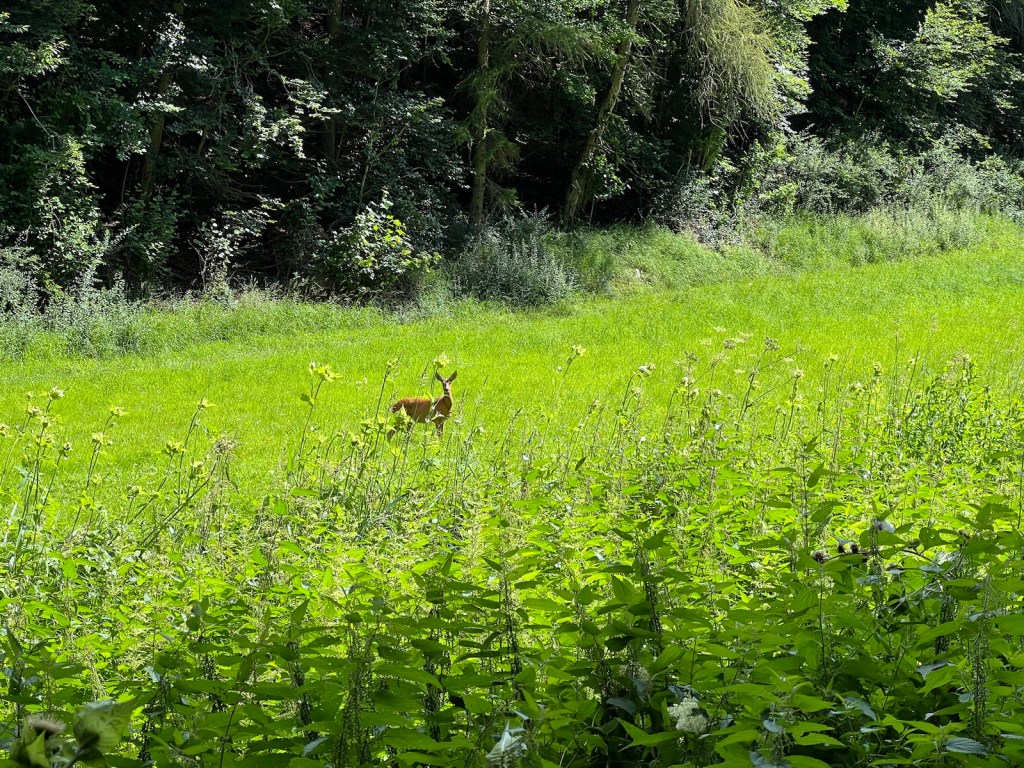 Today’s walk was even better than yesterday’s walk. The weather was perfect, even slightly chilly at 9 degrees at the start, but sunny and clear. I set off up a steep climb to the Rommensheimerheld and then along an idyllic trickling stream in the forest until I reached a place called Schönecker Schweiz which is an important nature reserve protecting the Eifel ecology. A deer bounced across a meadow.