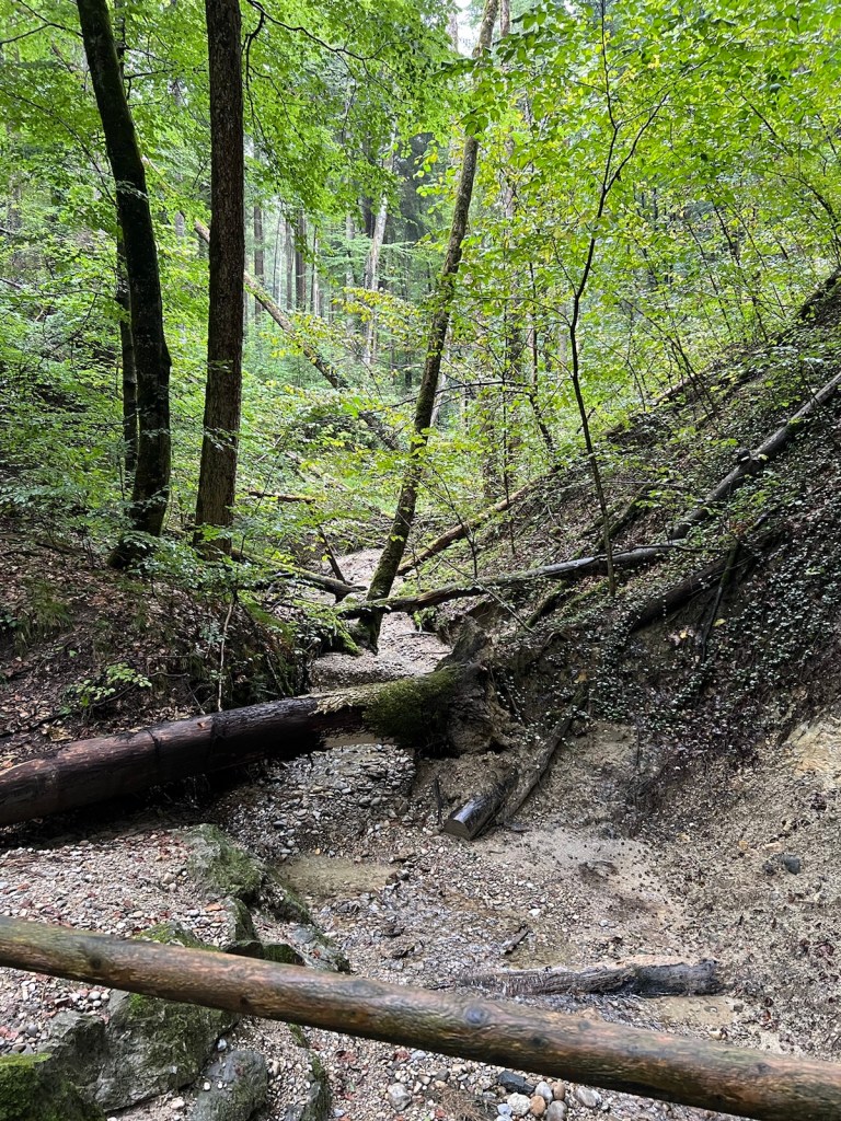 The journey to this Altusried took me through more dangerous forests, soaking pastures and over a precarious suspension bridge. When I arrived in Altusried, the whole town centre was being excavated for new sewage and fibre cables (you may ask why they are putting fibre in with the sewage). The bus stop had been temporarily relocated to an outlying Netto store and I only just found it in time. The bus was cash only and by the time I’d worked my way through several soaking layers of clothing in search of some cash, we were well behind schedule.
