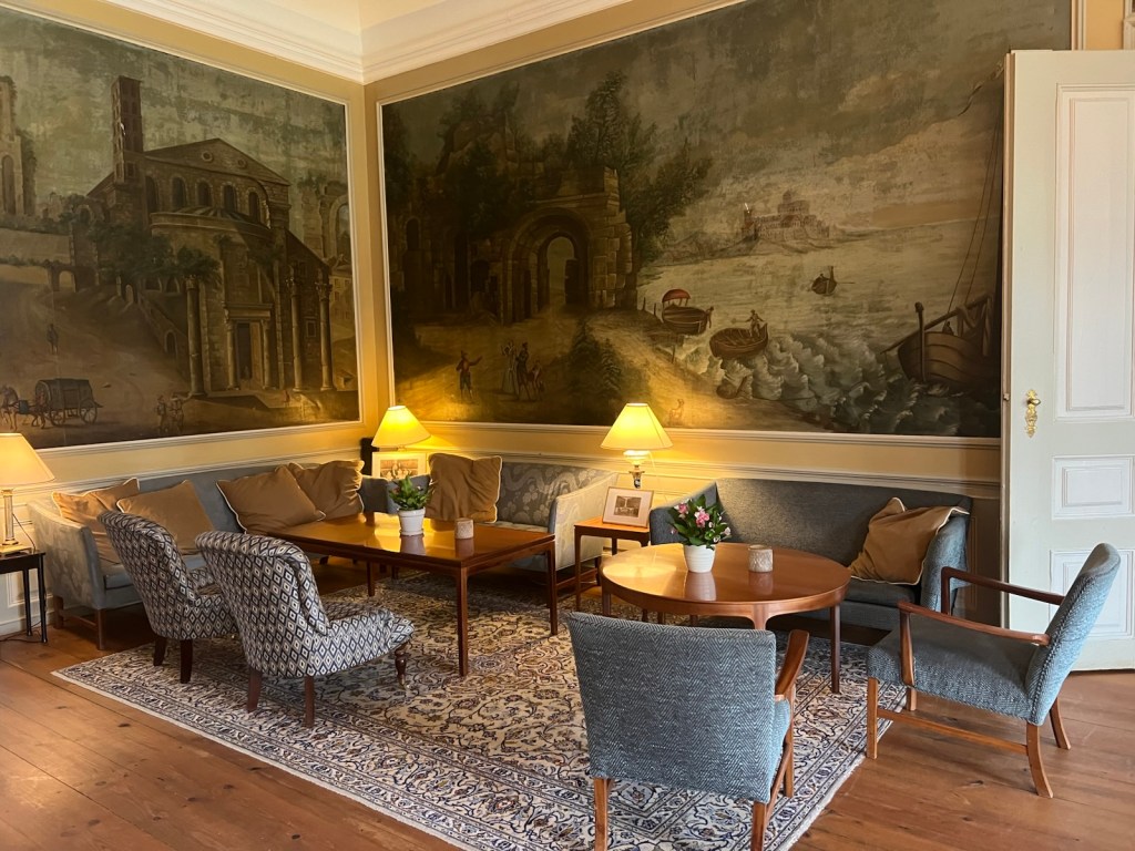 The hotel at Skjoldenæsholm was an experience. It was a 16th century royal estate which was eventually acquired by the Bruun de Neergaard family in 1794. The estate prospered, the peasants were educated and more land was purchased. Yesterday, when I arrived dripping wet, Dorothea Bruun de Neergaard, part of the 9th generation of the family, welcomed me at the front door. I thought I’d got the wrong address. The ground floor of this enormous mansion comprised room after room tastefully furnished with original 18th century tapestries, paintings and furniture. Family photographs and albums were everywhere. I said it looks like a National Trust house where all the furniture is taped off and “Do not touch” notices proliferate. Dorothea Bruun de Neergaard laughed and told me that they keep everything as it always has been and to make myself at home.