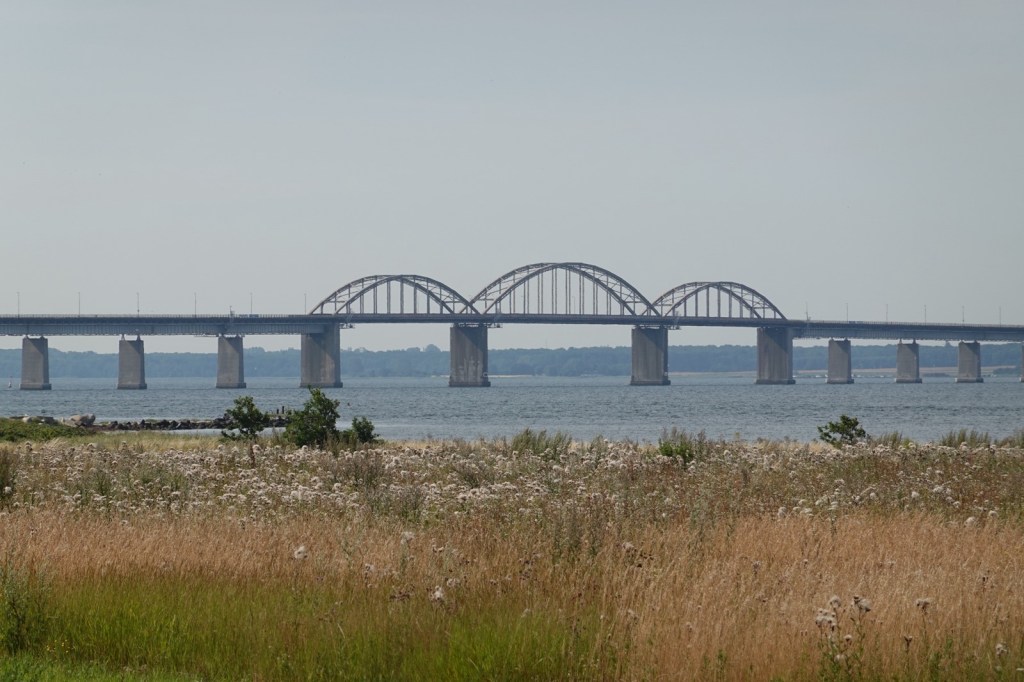 I caught the 08:13 train back to Vordingborg where the Danish Pilgrim trail was waiting to give me a short tour of the town. We went to the church which was open, being a Sunday. Incredibly, there was a Pilgrim stamp so I stamped my credential. After that we went out to see the remains of Vordingborg castle and then straight to the Storstrøm bridge which connects Zealand to Falster. The approach was a bit confusing because they’re building a new bridge and it’s difficult for the walker to navigate to the correct bridge because there are no signs; they don’t expect many walkers, the bridge being 3.2Km long and nothing at either end. The old bridge was built by a British company in the 1930s but the new bridge is being built by the Italians. Once opened, the old bridge will be demolished.