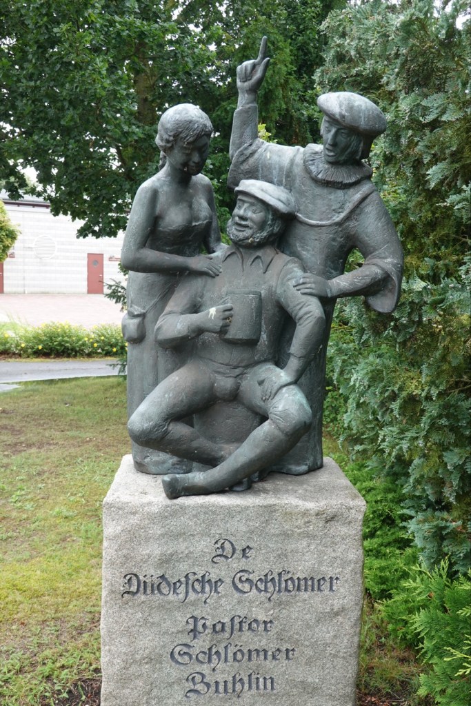 The statue commemorates characters from “De Düdesche Schlömer” (The German Glutton/Boor), a Middle Low German drama written by Pastor Johannes Stricker . The bronze sculpture was created by artist Karlheinz Goedke and erected by the Förderkreis Kloster Cismar (Friends of Cismar Monastery) .