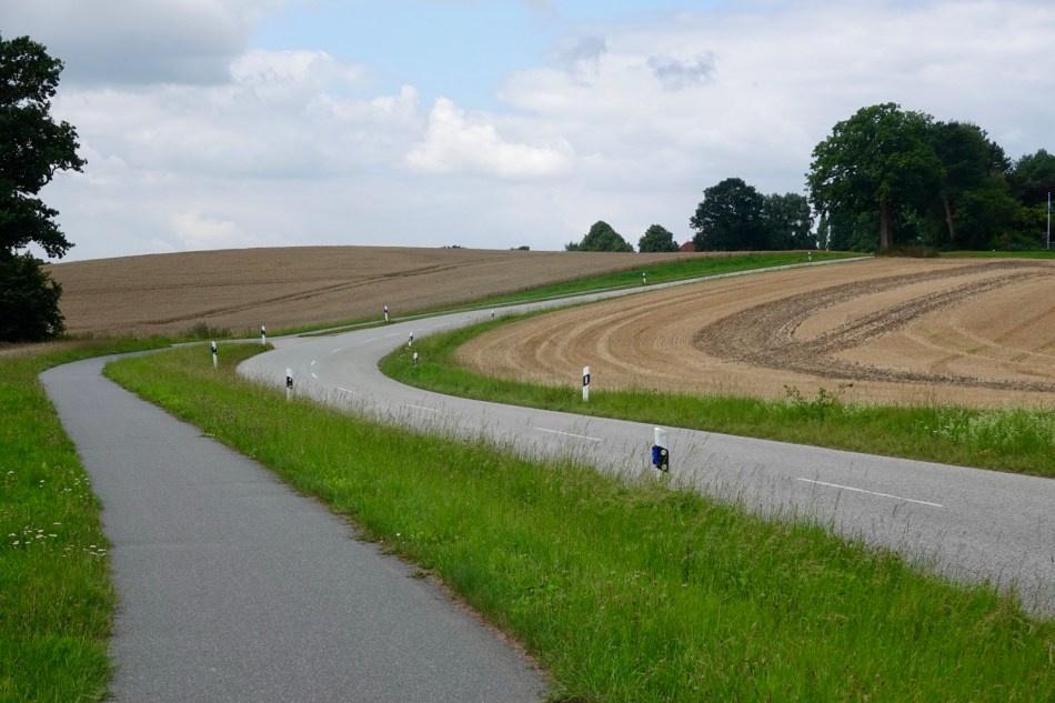 I filled my water bladder and emptied my backpack apart from the rain gear and set off. Once clear of the resort the main interest lay in the barley fields. The landscape is unrelentingly flat thanks to the last ice age when massive glaciers mercilessly levelled everything in their path. An occasional hamlet appeared. In one house, two huge and ferocious dogs leapt at the fence, possibly trying to tell me their master was away and they hadn’t been fed for days but I wasn’t going to be their salvation.