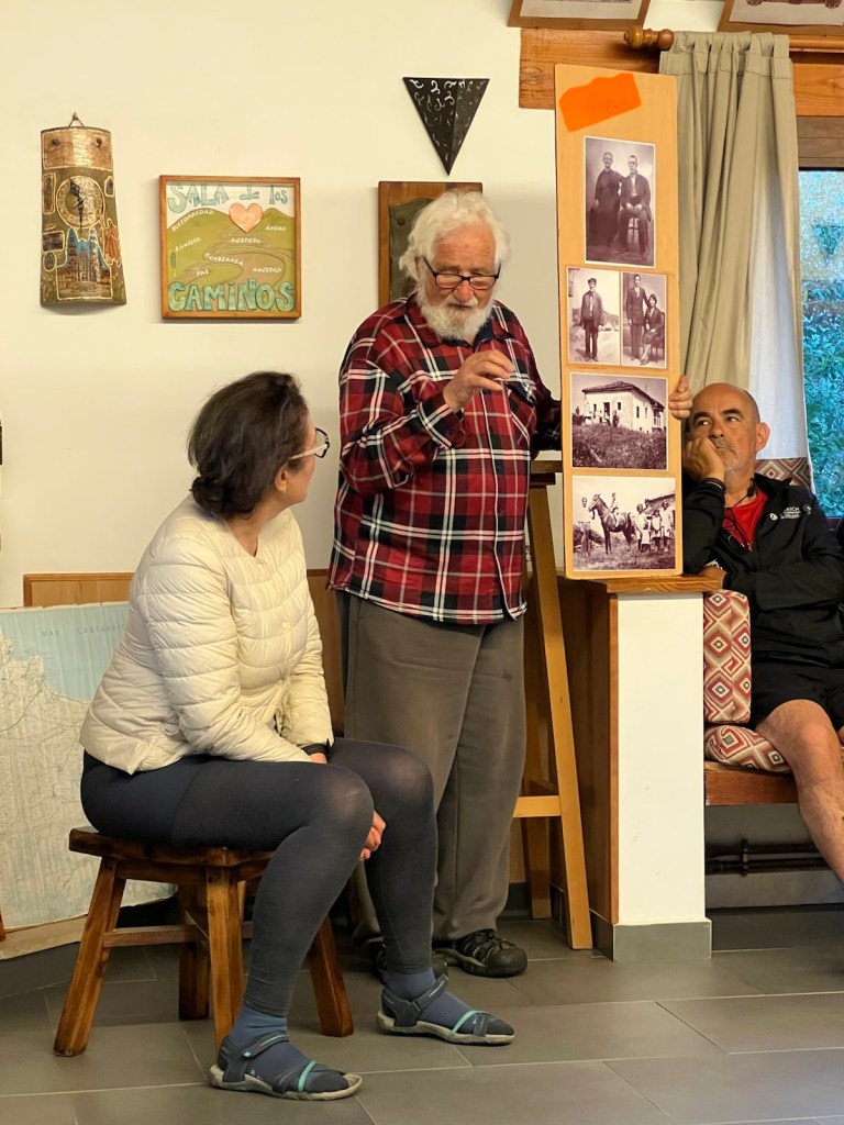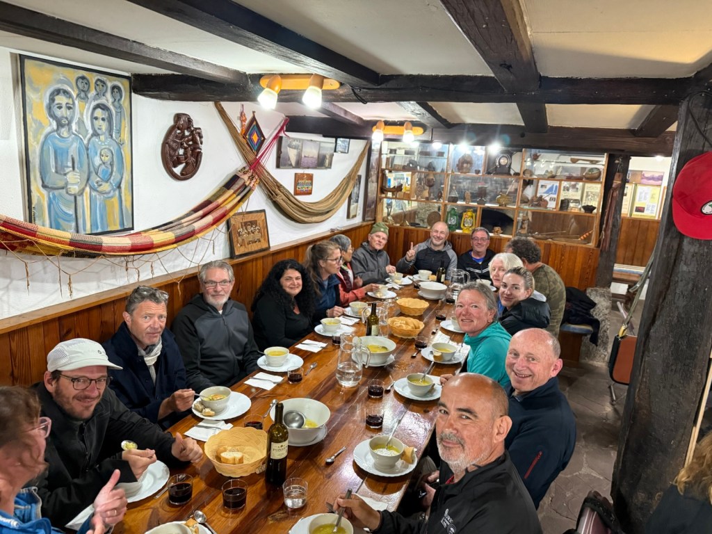Yesterday evening was underwhelming. At 7:30pm we were led into a room where the Fr Ernestio Bustio, who founded the albergue, spoke for 90 minutes, not about his work around the world but about his grandparents, languages, love etc. It was all in Spanish of course. Someone volunteered to translate but it became increasingly difficult for her to understand and convey any meaning from the rambling words. Meanwhile the pilgrims were tired and starving. Dinner was served at 9pm and consisted of chicken noodle soup followed by pasta in a sugary tomato sauce. There was plenty of food but not the kind you’d want to eat just before bed.