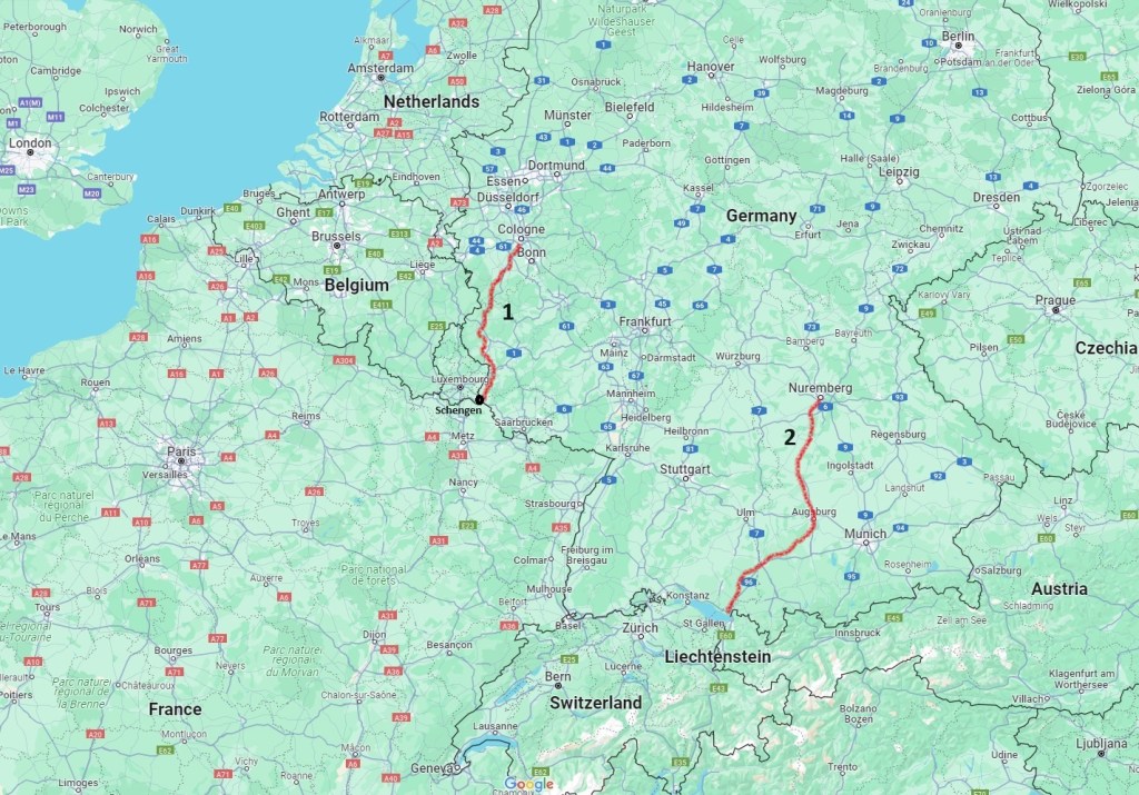 First, the little known Via Coloniensis pilgrimage (317 Km), named after the Roman road that was built from Trier to Cologne. Starting in Cologne, I’ll follow the Rhine to Bonn and then head south across the Eifel National Park, the Schönecker Schweiz and the Ferschweiler Plateau to Trier, the oldest city in Germany, founded by the Romans. After that, I’ll follow the Mosel to Schengen, an international tripoint between Germany, France and Luxembourg, and the place where the Schengen Agreement was signed in 1985, removing all border controls within the zone. That will take me two to three weeks.