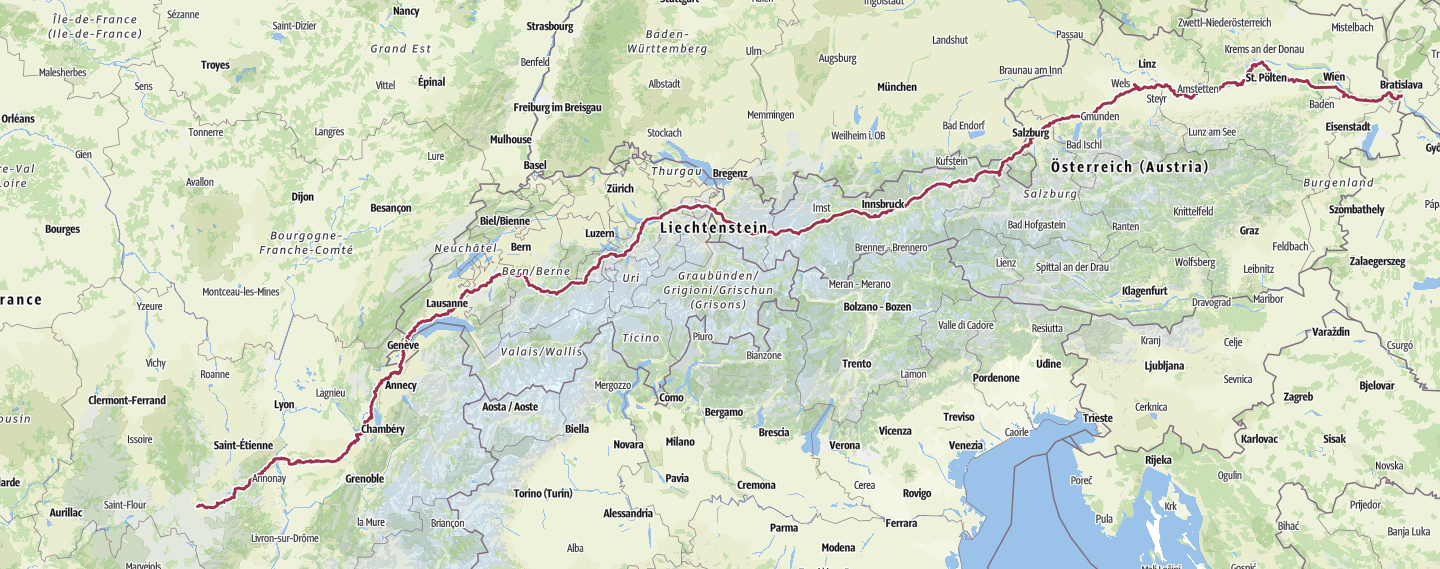 It’s time to get back on the Camino, the way of St James. The paths to Santiago de Compostela fan out across Europe, forming a network called the Jakobsweg in German speaking lands. My plan is to start in Bratislava, capital of Slovakia, and walk across Austria and Switzerland towards Le Puy-en-Velay in France, to link up with my previous walks to Santiago de Compostela. However, I don’t have enough days on my Schengen visa to reach Le Puy so I will stop somewhere with a train station and continue another time.