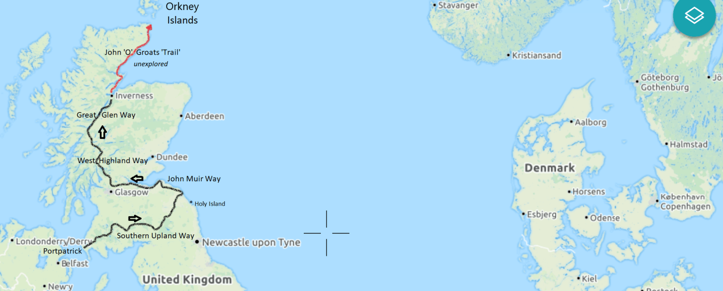 I plan to start my walk on 24 July at the beginning of the E2 European Long Distance Footpath in Portpatrick on the south west coast and follow the Southern Upland Way to Cockburnspath on the east coast. After that comes the John Muir Way (the same John Muir as in the John Muir Trail in America but this one is a pleasant stroll between Costa Coffee shops) which takes me through Edinburgh to Lennoxtown. Here I will head north along the popular West Highland Way and then the Great Glen Way, drifting in and out of souvenir shops, tartan, shortbread biscuits, whisky distilleries etc. until I reach Inverness. It should be a breeze.